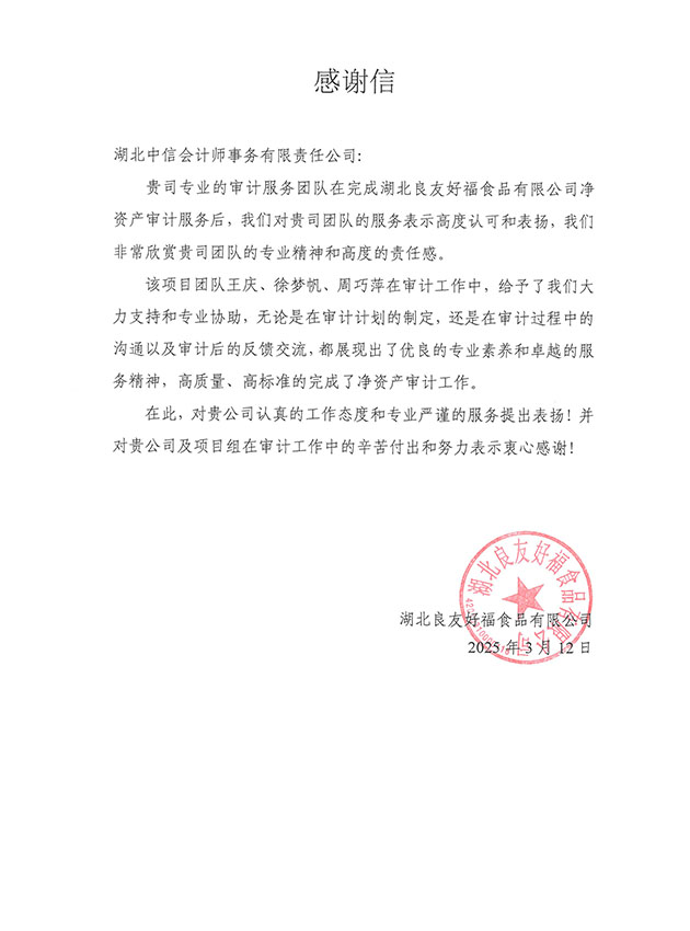 湖北良友好福食品有限公司感謝信