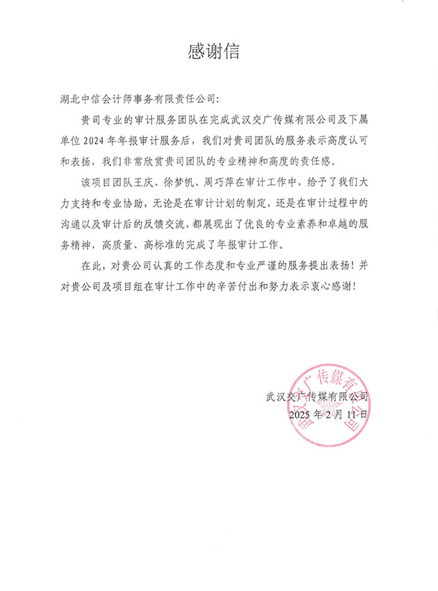 武漢交廣傳媒有限公司感謝信