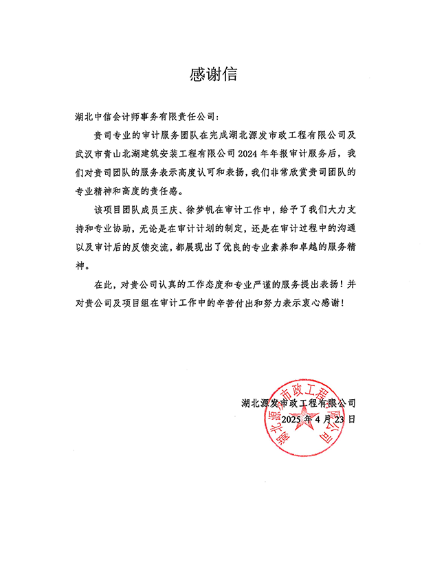 湖北源發(fā)市政工程有限公司感謝信