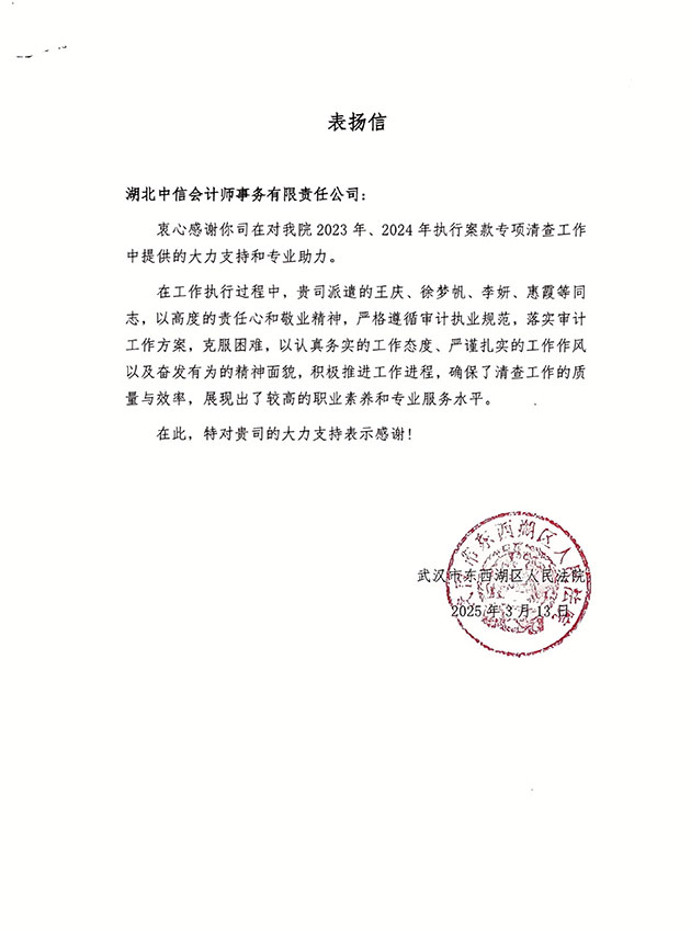 武漢市東西湖區(qū)人民法院表揚(yáng)信