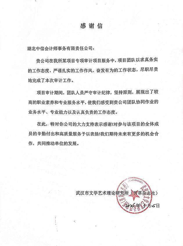 武漢市文學(xué)藝術(shù)理論研究所芳草雜志社感謝信