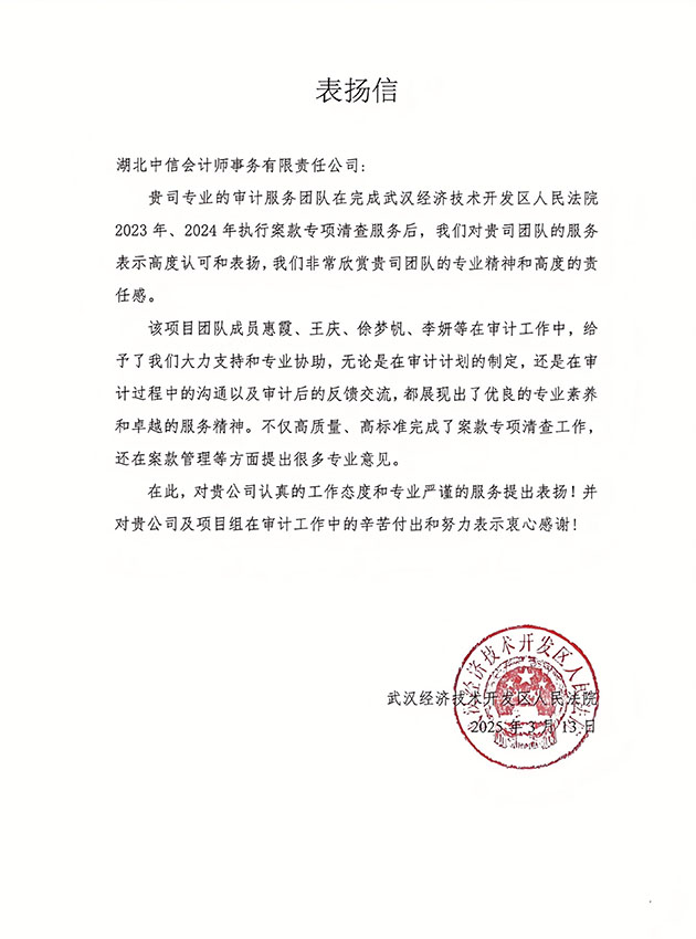 武漢經(jīng)濟(jì)技術(shù)開發(fā)區(qū)人民法院表揚(yáng)信
