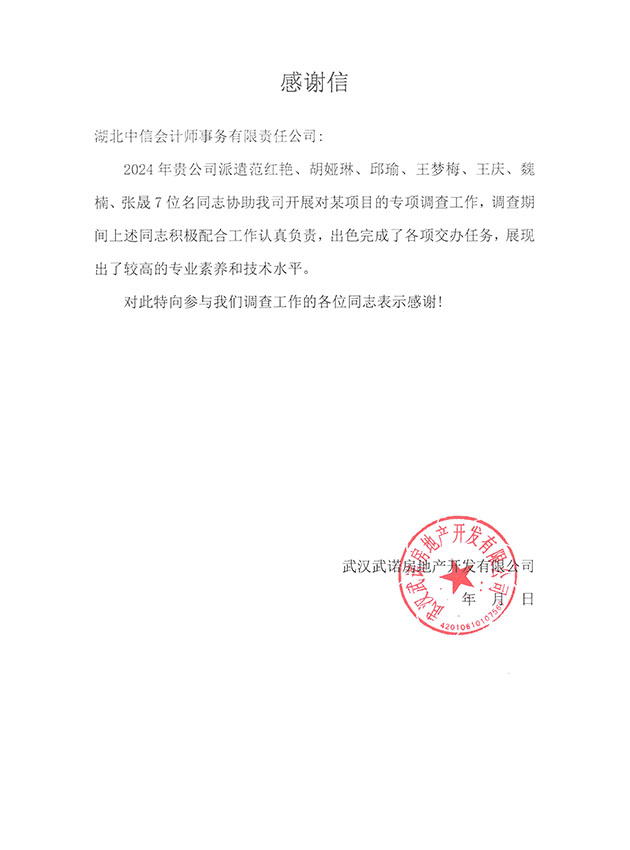 武漢武諾房地產開發(fā)有限公司專項調查項目感謝信