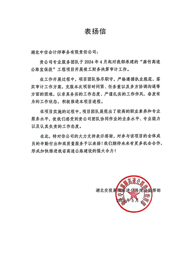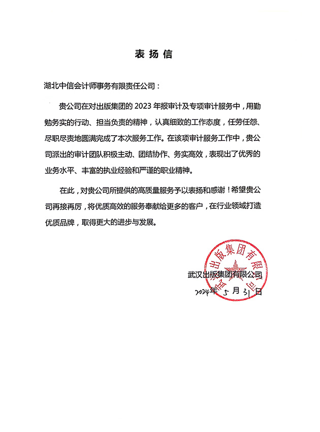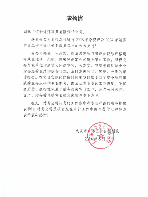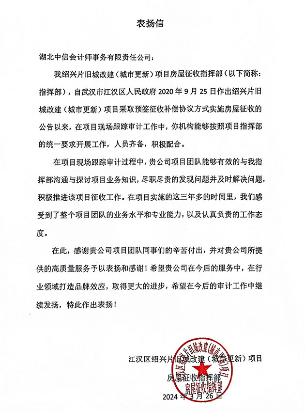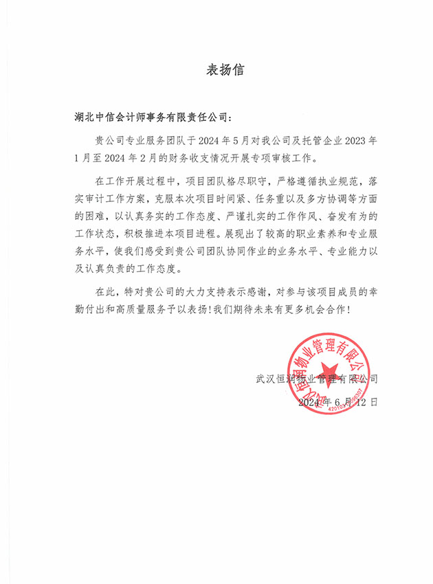 武漢昌索房地產開發(fā)有限公司專項調查項目感謝信
