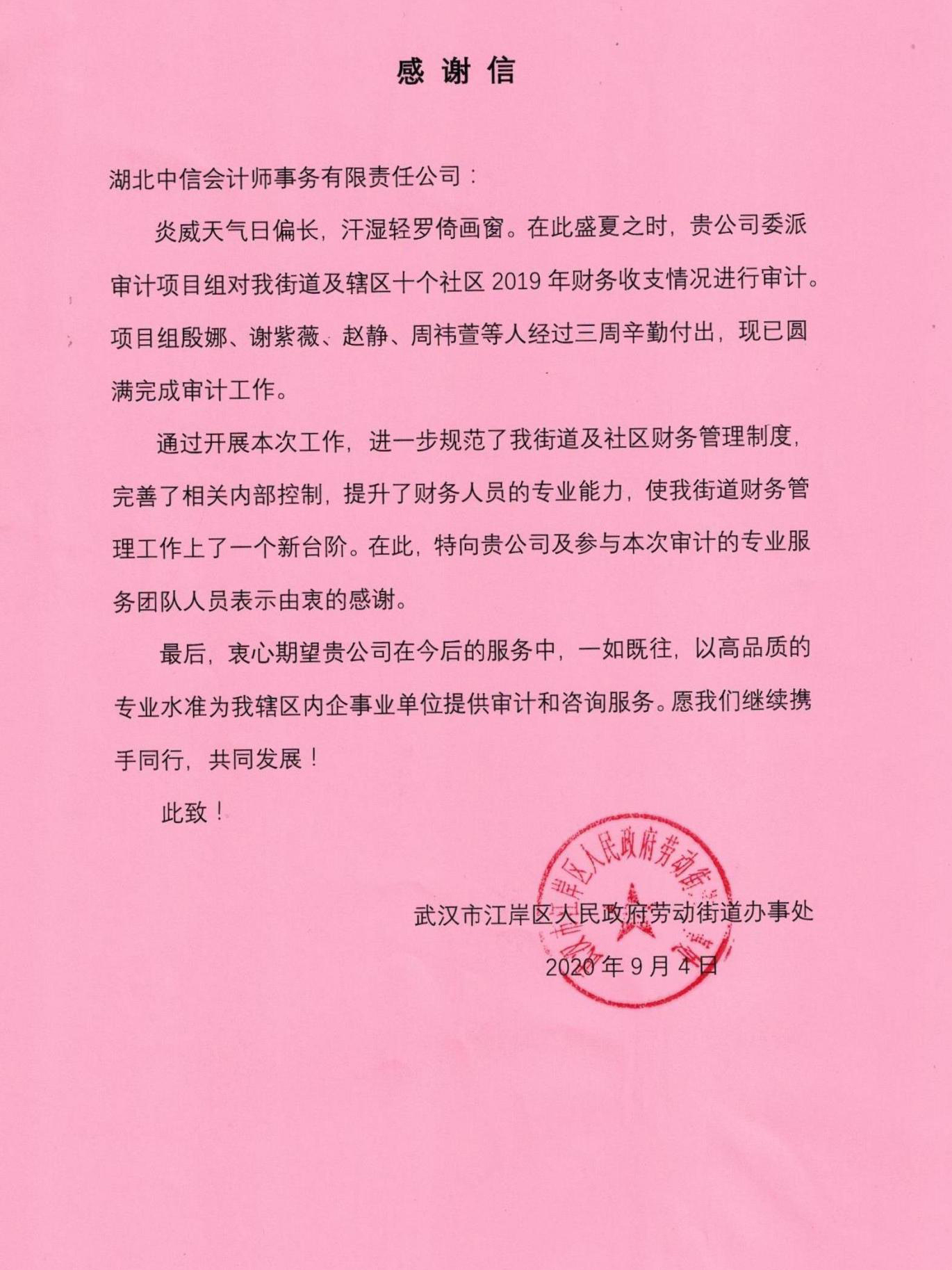 江岸區(qū)勞動(dòng)街辦事處感謝信