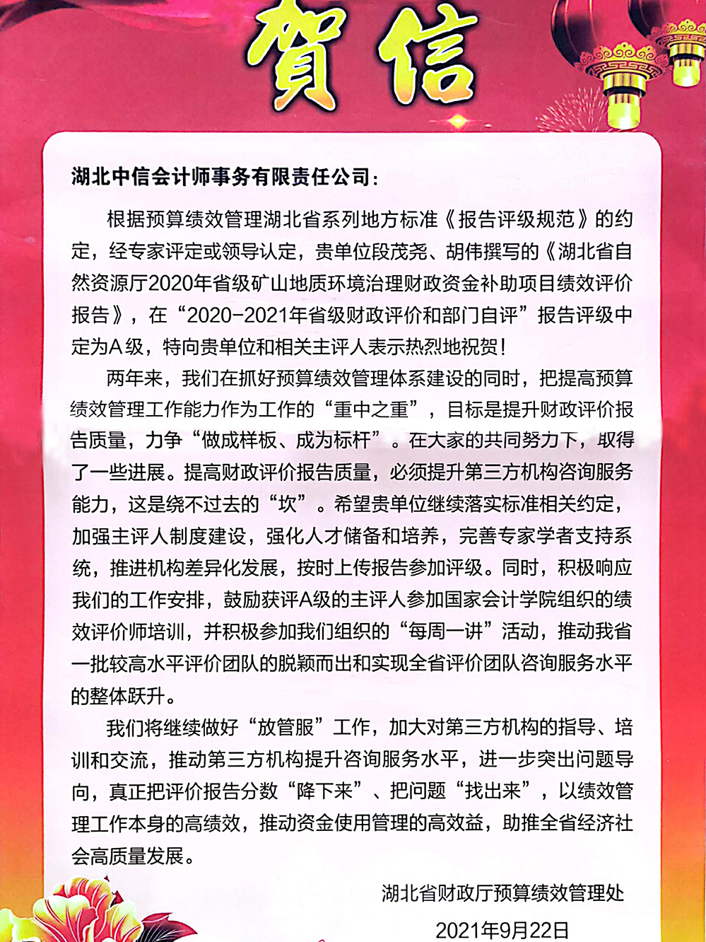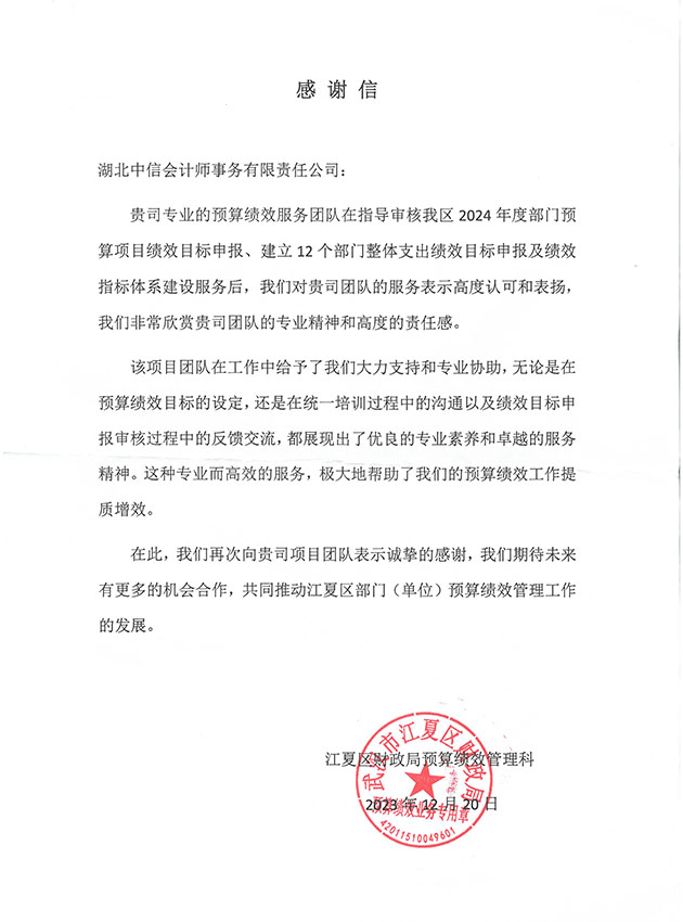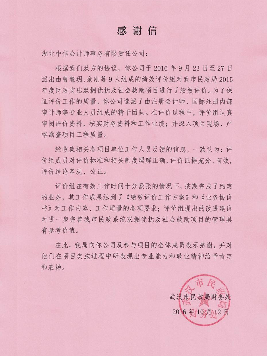武漢市民政局財(cái)務(wù)處績(jī)效評(píng)價(jià)項(xiàng)目感謝信
