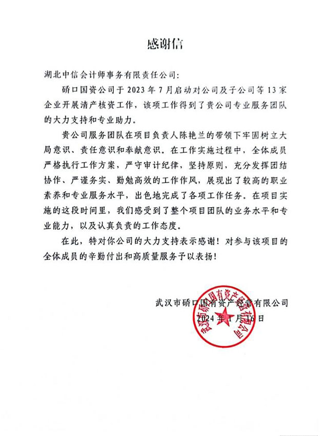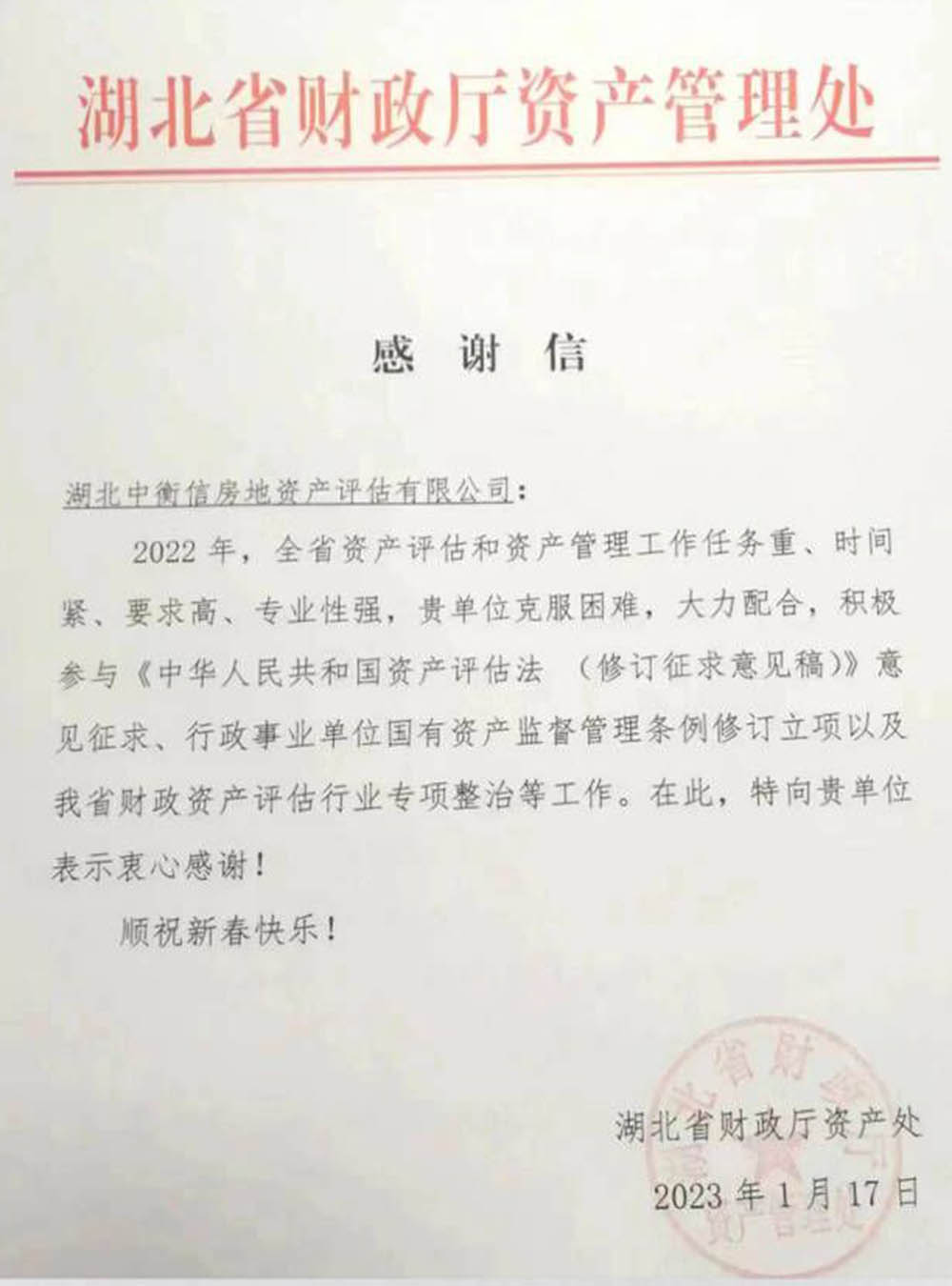 評(píng)估公司收到省財(cái)政廳資產(chǎn)處感謝信