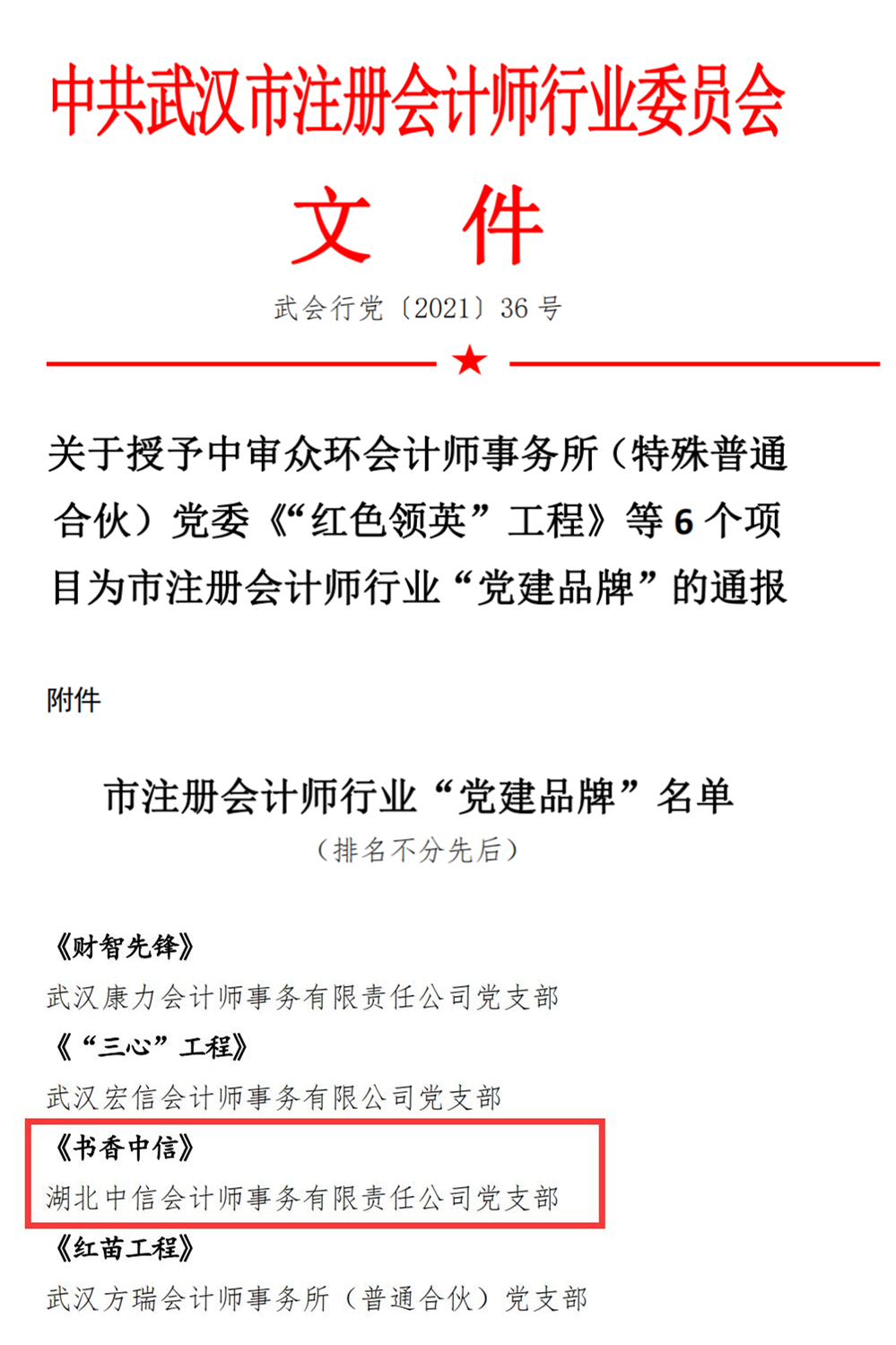 《書香中信》被授予武漢市注冊(cè)會(huì)計(jì)師行業(yè)黨委“黨建品牌”